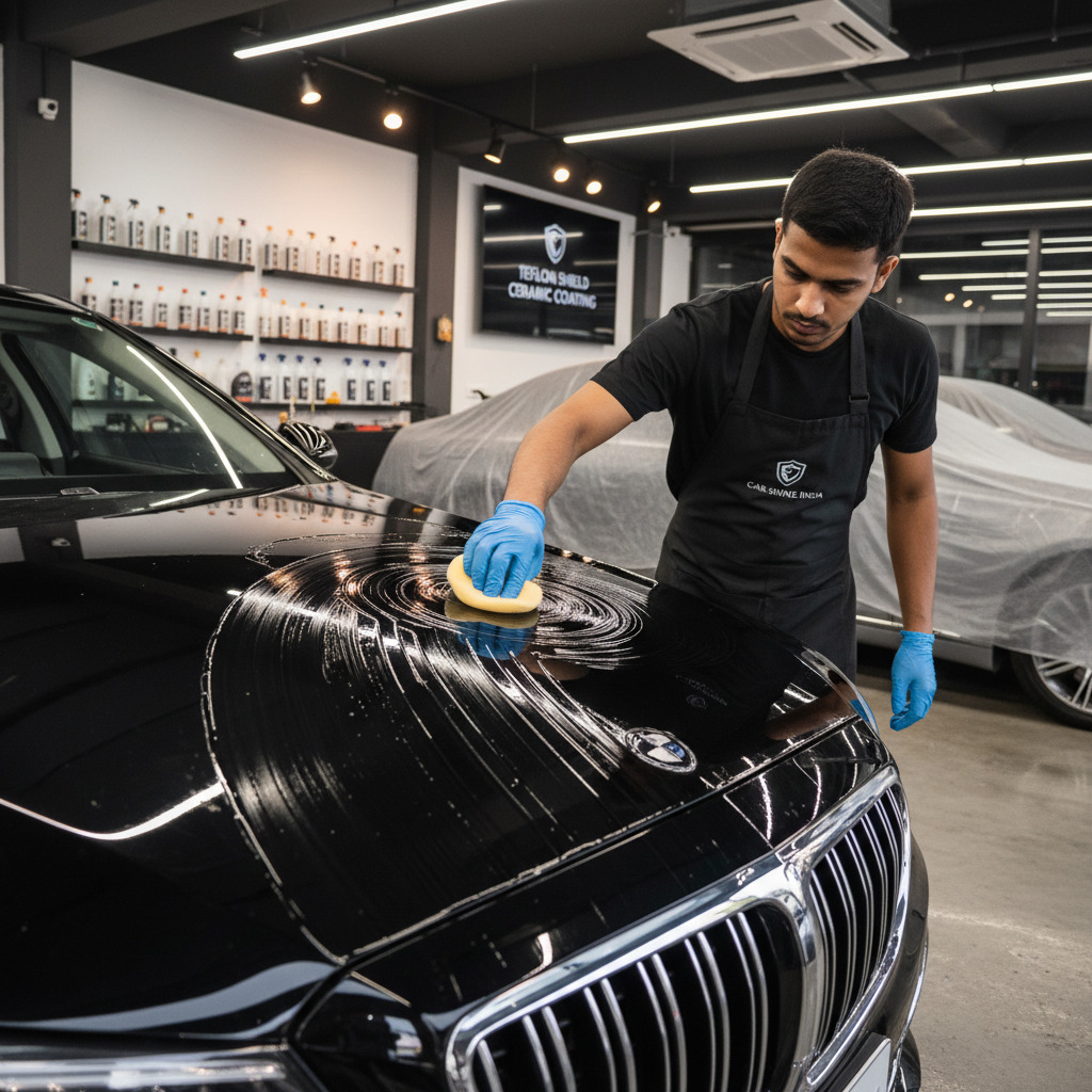 The coating is applied as a liquid and buffed to create a thin protective film. It fills minor swirl marks and adds gloss. Most detailers in India use branded teflon products from 3M, Meguiar’s, or local alternatives.